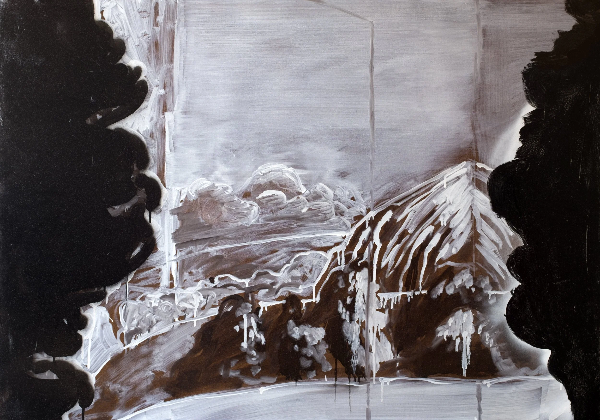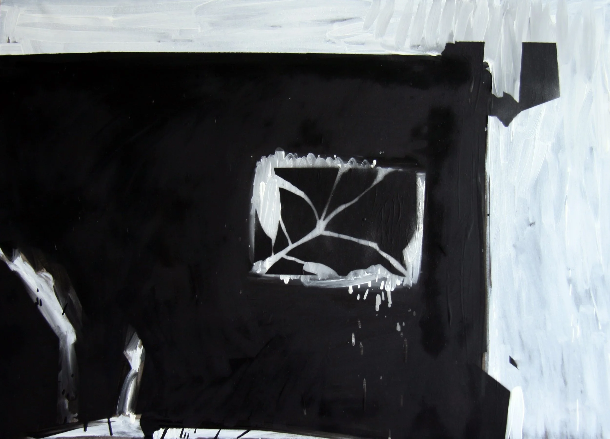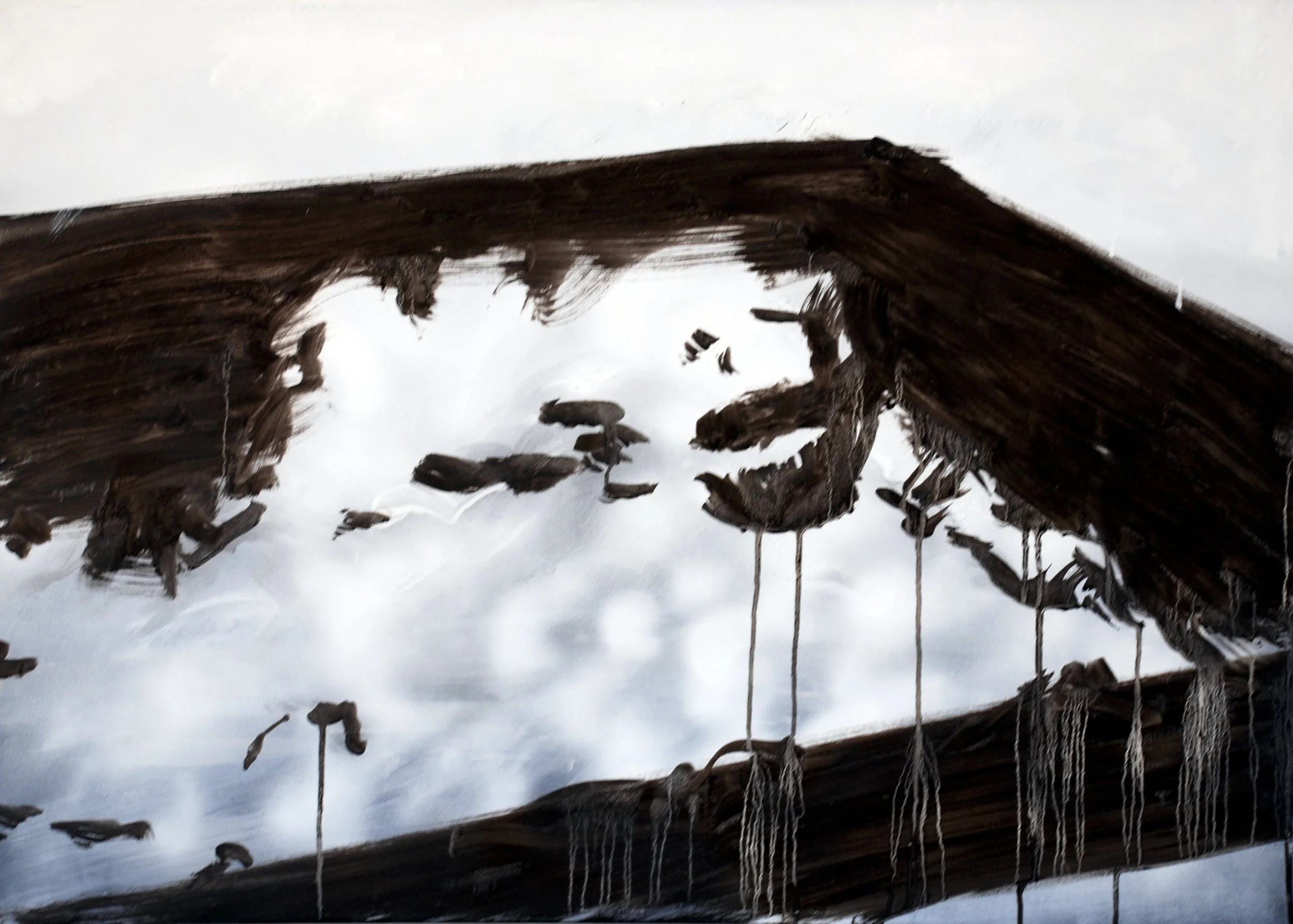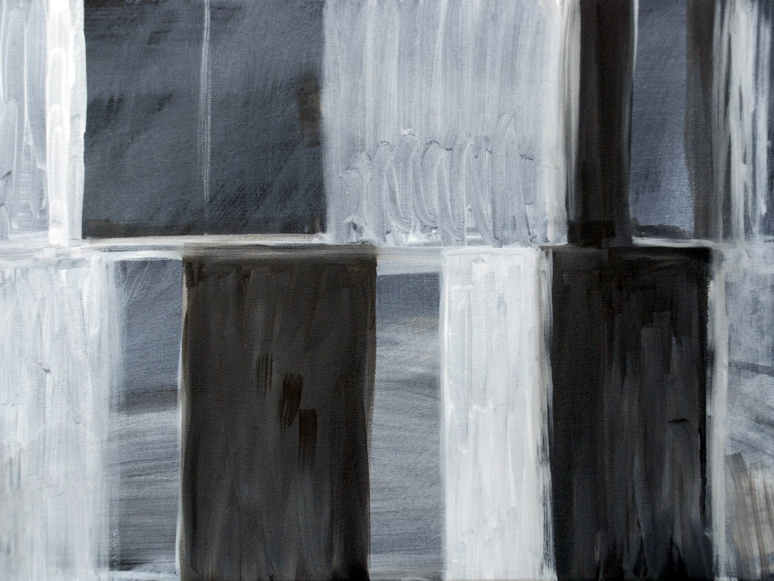 A series of paintings, oil on canvas, white on black, created from images of pleasant landscapes, details of solitary places, desolate panoramas with out-of-place elements. In translating from image to image, the attempt is to further abstract. The goal is partial abstraction.