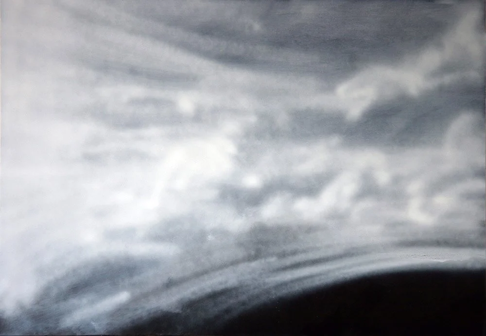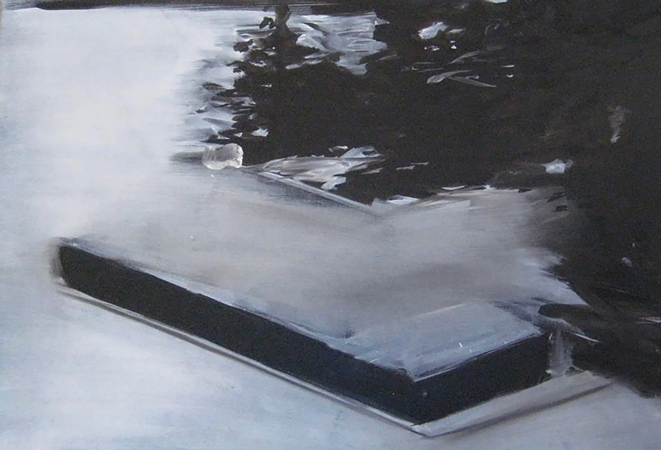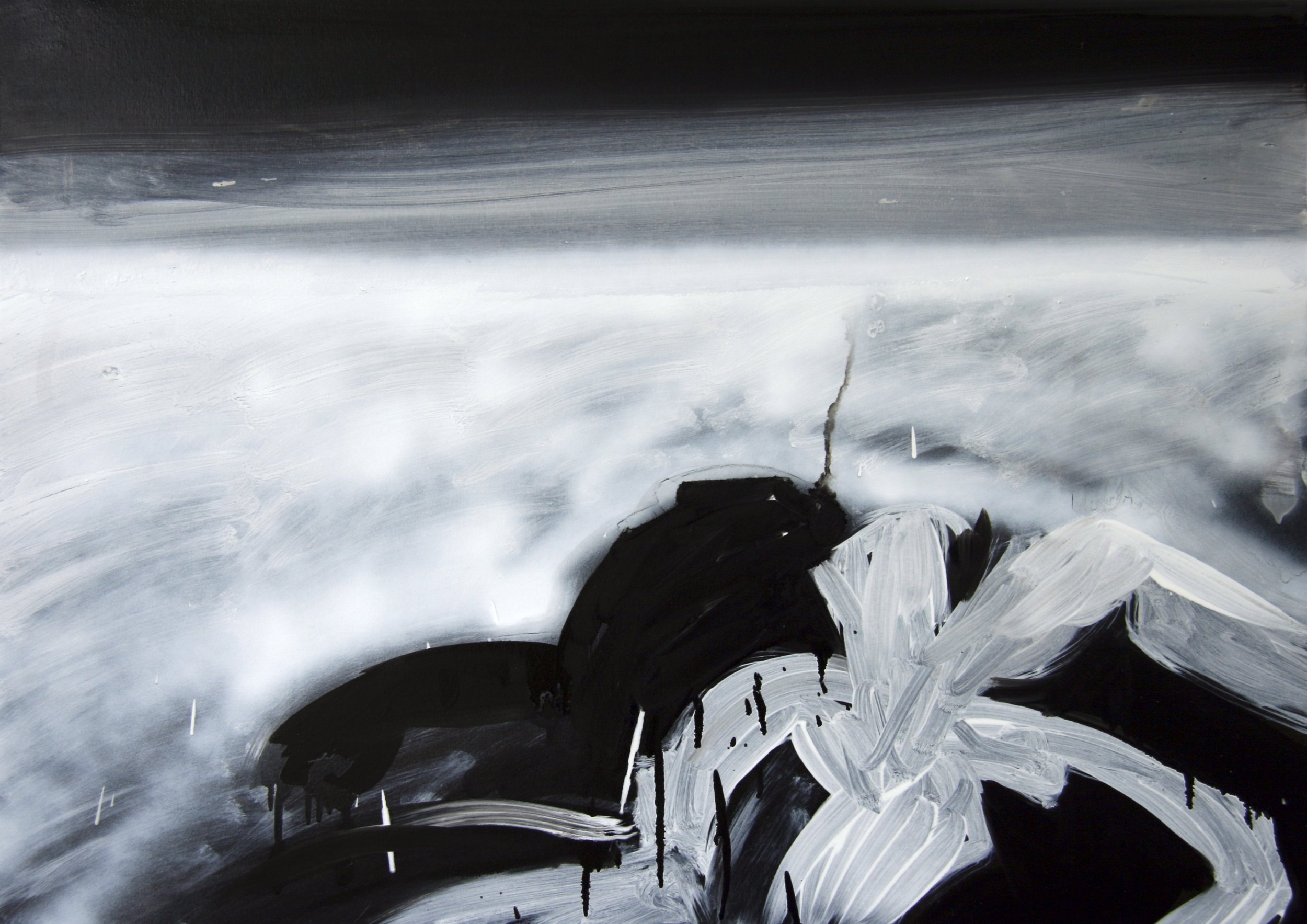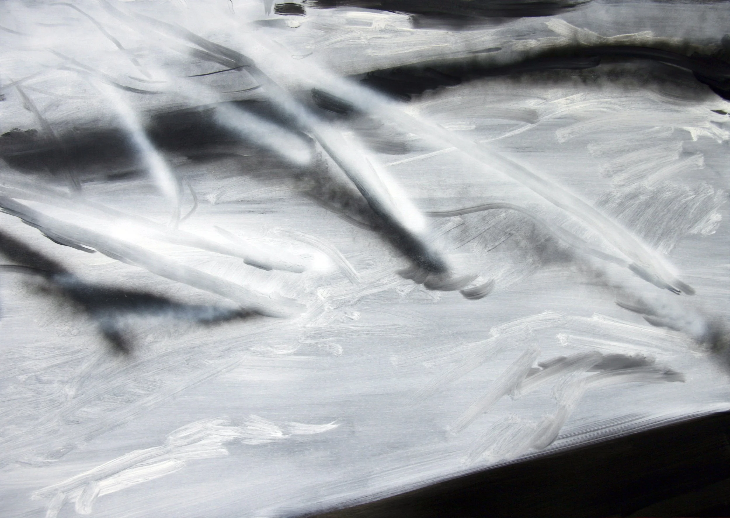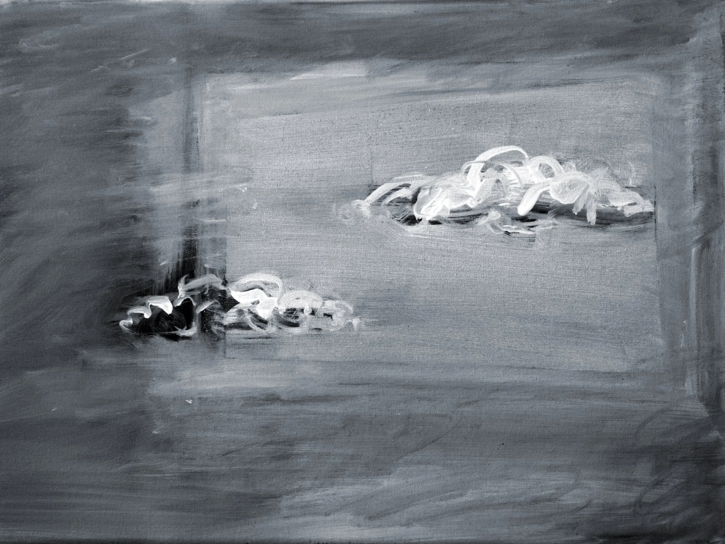 A series of paintings, oil on canvas, white on black, created from images of pleasant landscapes, details of solitary places, desolate panoramas with out-of-place elements. In translating from image to image, the attempt is to further abstract. The goal is partial abstraction.